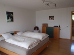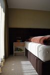 Ein gepolstertes Betthaupt, ein Wollteppich im Schlafbereich, eine Tapete und Vorhänge machen den Schlafbereich zu einer kleinen Wohlfühloase mit viel Gemütlichkeit.