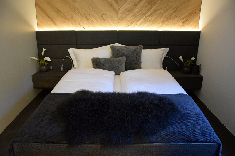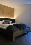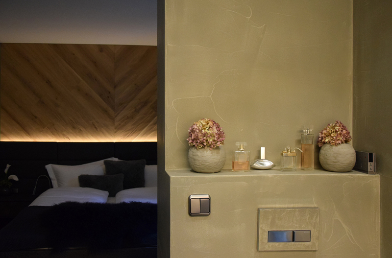 - Hinter dem Bett wurde ein indirekt beleuchtetes Betthaupt in Stoff und darüber eine beleuchtete Holzwand aus gehackter Eiche eingesetzt.
